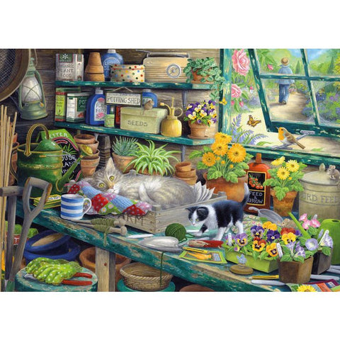 Discover a delightful retreat with our Cats Hideaway jigsaw puzzle featuring the charming artistry of Claire Comerford. This 1000-piece puzzle invites you to immerse yourself in a whimsical scene that combines the joy of cats, flowers, and gardening in a beautiful potting shed.