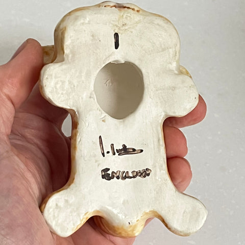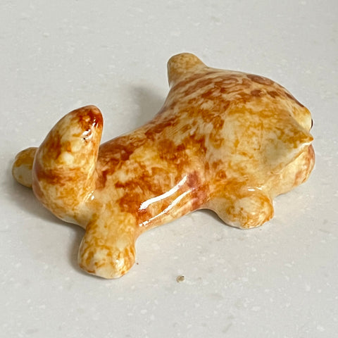 Ceramic cat figurine with brown spots on a light gray background