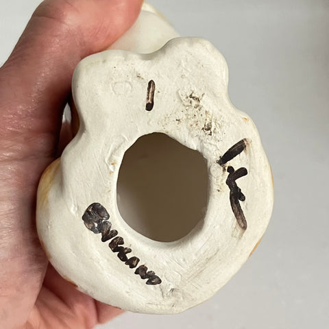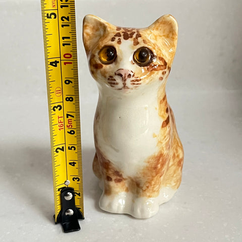 Small ceramic cat figurine with brown and white pattern on a light gray background